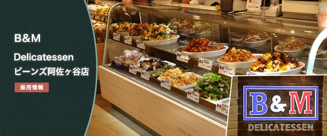 B&M DelicatessenはB&M初の洋惣菜やお弁当の持ち帰り専門飲食店として2011年12月にJR阿佐ヶ谷駅直結施設ビーンズ阿佐ヶ谷(旧:Dila阿佐ヶ谷)にオープン致しました。