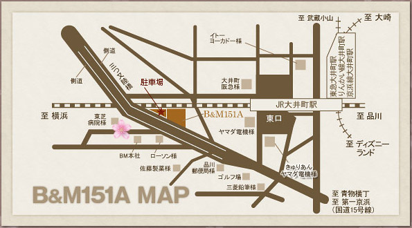 JR京浜東北線、東急大井町線、そしてりんかい線の各大井町駅から徒歩約5分ほどの場所にある151A店。その近くには東芝病院があり、病院へ向かう道の両脇に桜の木が植えられています。行き交う人々の心を癒してくれるようで、とても綺麗です。 |