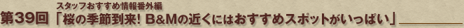 さて、今回は番外編ということで、各店舗付近の「桜情報」をご案内いたしましたがいかがでしたか?この情報をご参考に、お花見を楽しんで頂ければ幸いです。もちろん、お花見の際はB&Mで美味しいお食事もお楽しみ下さい!ご来店、お待ちしております! |
