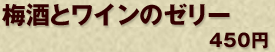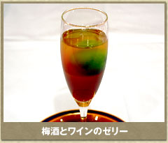 | おしゃれなグラスに2層のゼリーが入っていてそれに大きな梅が丸ごと1個浮かんでいます。ゼリーは、上の透明な部分が梅酒のゼリー。そして下の赤い部分が赤ワインのゼリーです。上品な甘さで、ほんのりお酒の香りがして、大人向けのスイーツです。 |