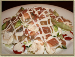 栄養満点のマッシュルームに生ハムを組み合わせ、イタリアンドレッシングをベースにチーズたっぷりのシーザードレッシングをトッピングしました。