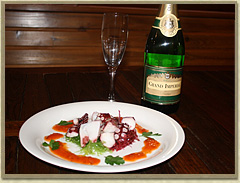 彩り豊かな海草の上にマリネしたタコを乗せました。特製ソースを付けてお召し上がり下さい。