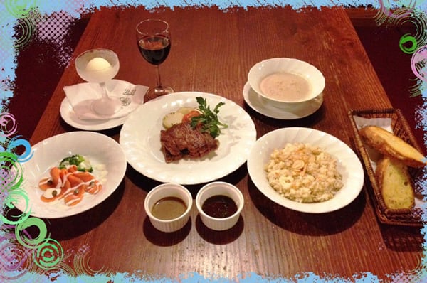 コース内容~オードブル・スープ・熟成国産和牛のステーキ150g・ガーリックライス又はバケット・ドリンクサービス・ジャージーヨーグルト(グラスワイン付はプラス¥200)。また、このステーキは単品(¥3,000)でもご用意しております。