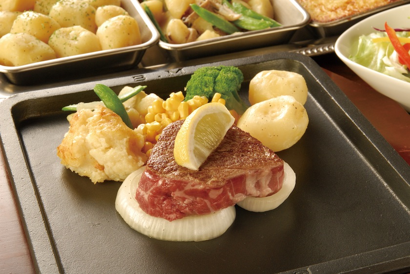 B&M創業時からの人気、看板メニューで柔らかく味があるのが特徴です。※画像はヤングステーキ、別売のサーバーサービスを添えています