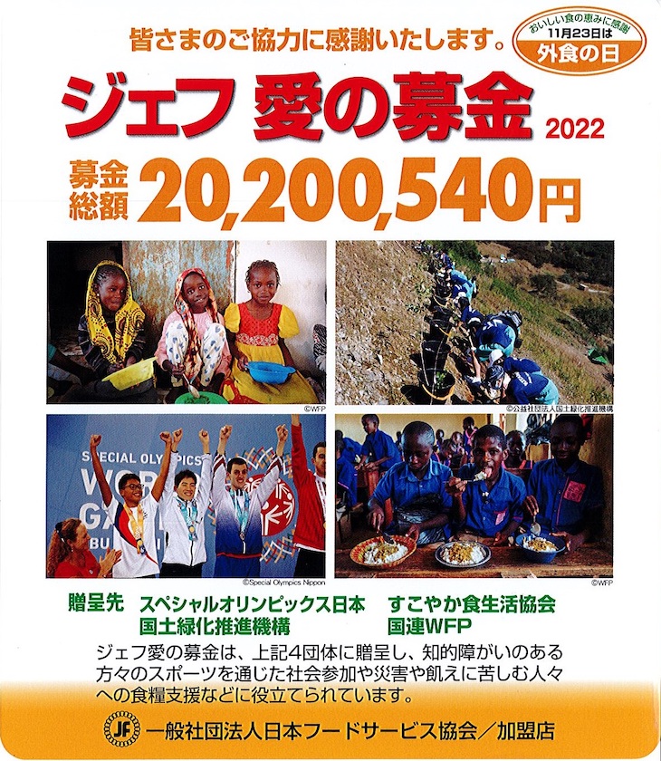 この「ジェフ愛の募金キャンペーン」というのは毎日たくさんのお客様とふれあうことのできる外食産業の特徴を活かした社会貢献活動の一環として、1984年から行っている募金活動になります。