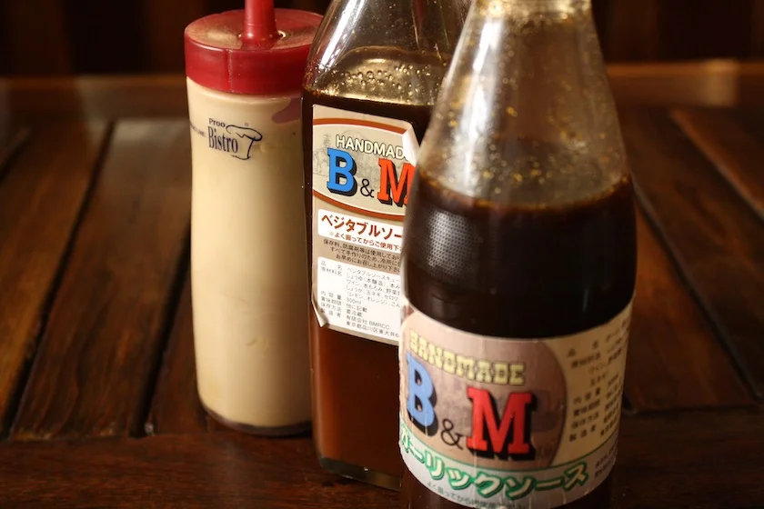 お席に用意しているステーキソース(ガーリックソース、フルーティーソース)やマスタード、セットのサラダにかけているドレッシングもB&Mオリジナル、自家製となっています。