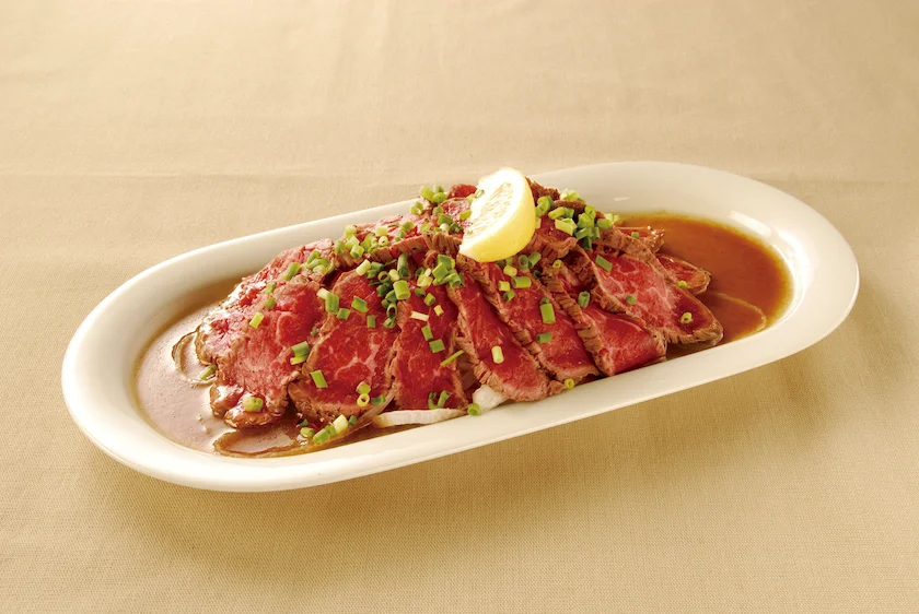 自店で焼き上げた自家製ローストビーフを食べやすくカットし玉ねぎの上に載せ、オリジナルドレッシングをかけました。